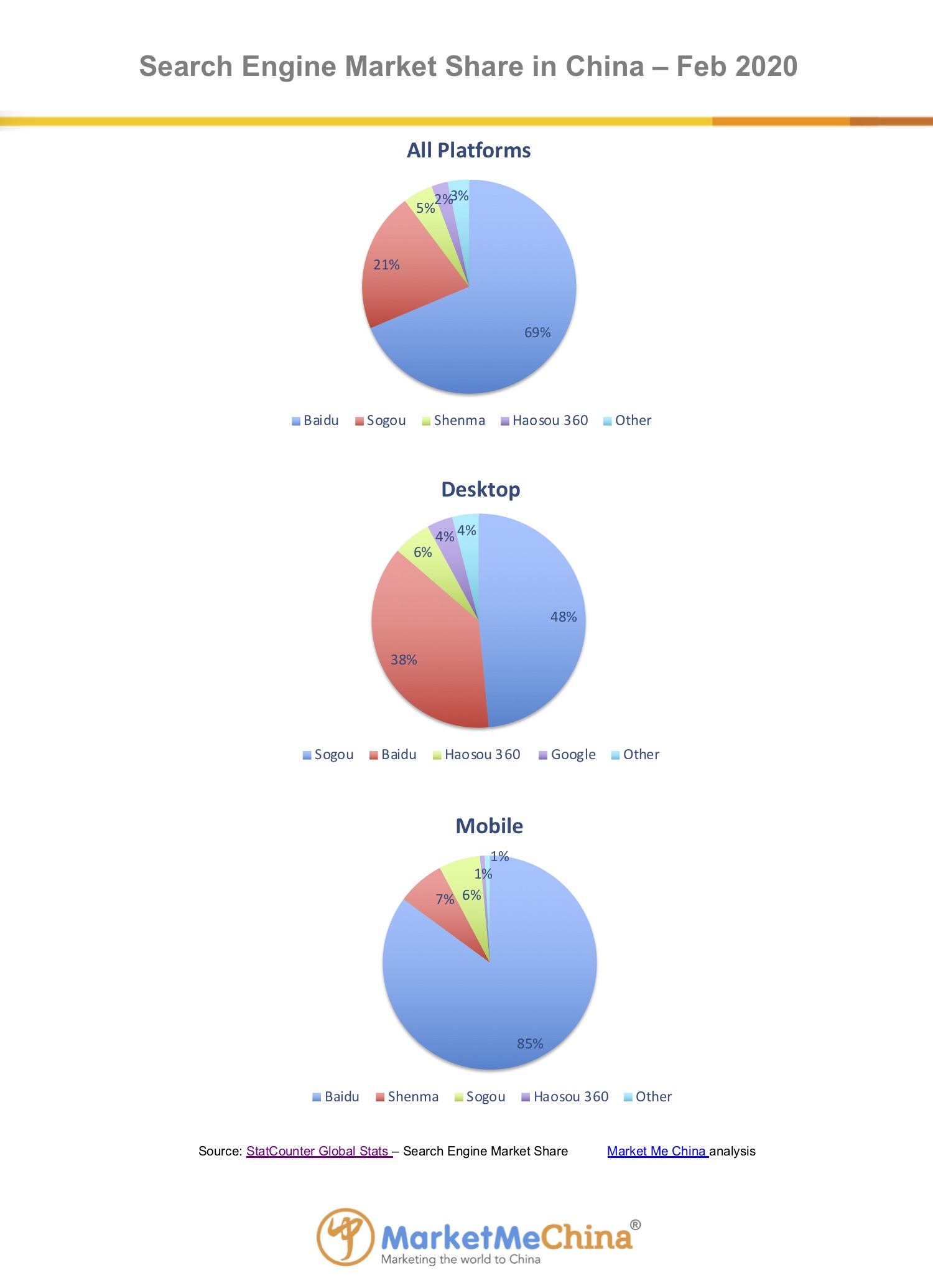 By Feb 2020, Baidu market share dominates the search engine market in China, in terms of all platforms (68.66%) and mobile (85.08%) – Mobile still accounts for the most search engine market share. Sogou search engine surpassed Baidu again, and reached #1 in terms of desktop market share (48.48%).